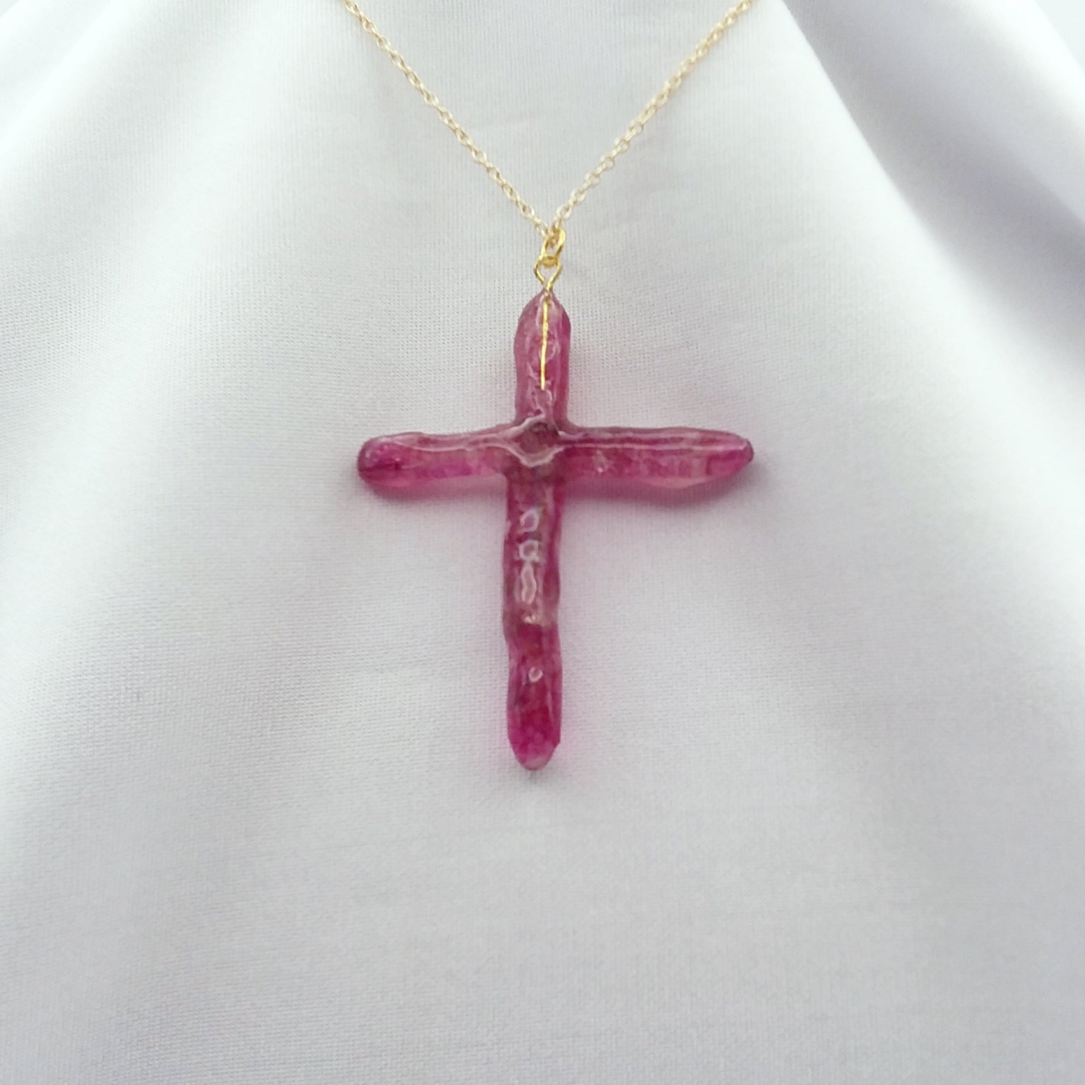 Red Titanium Quartz Cross necklace 2 3/8" with Goldtone chain