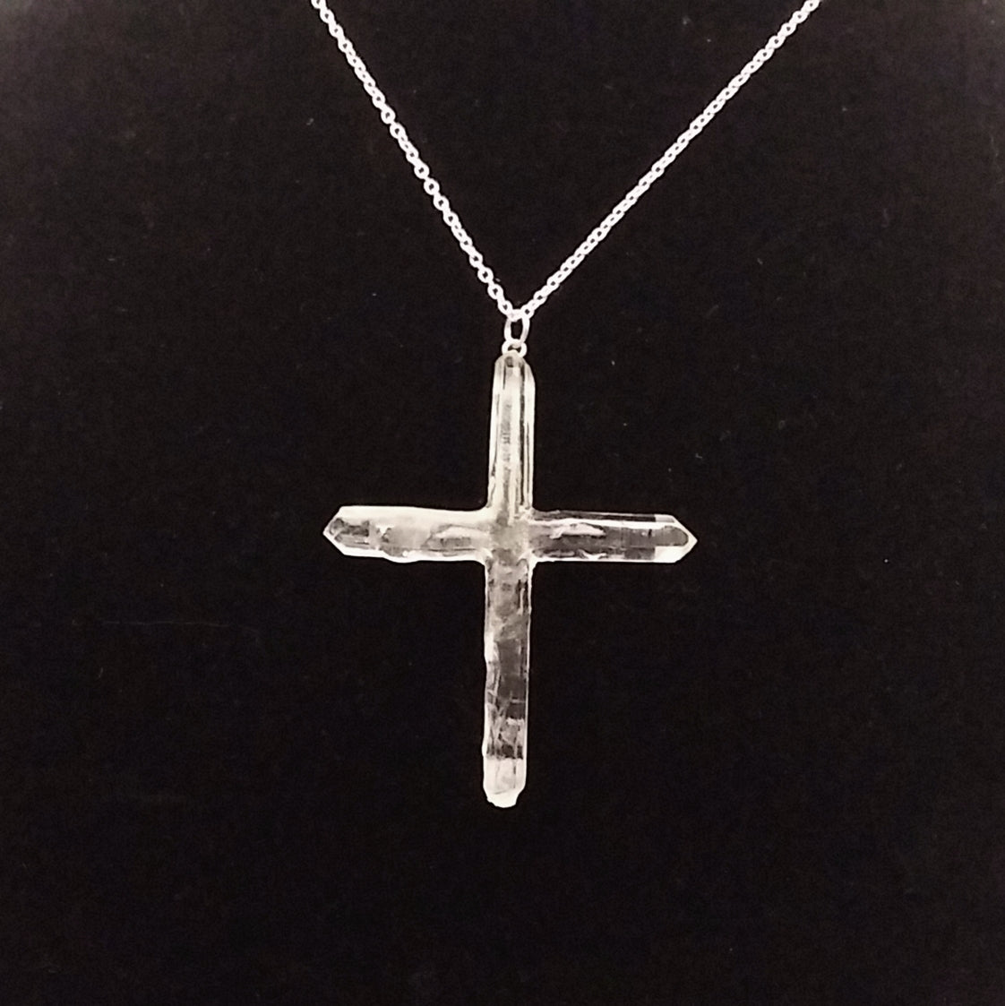 All natural Quartz points hand crafted into a Cross. The cross is one of a kind since no 2 quartz crystals are the same. The points are matched as close as possible by the artist to create a unique work of art. This one is approximately 2 3/8" tall and 2" wide.  It has a silver tone loop and comes with a 16" necklace that extends to approximately 18". The photos are of the actual necklace for sale.