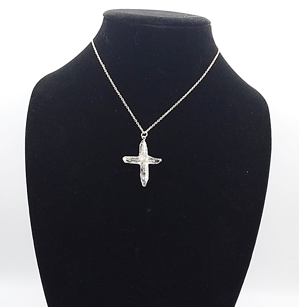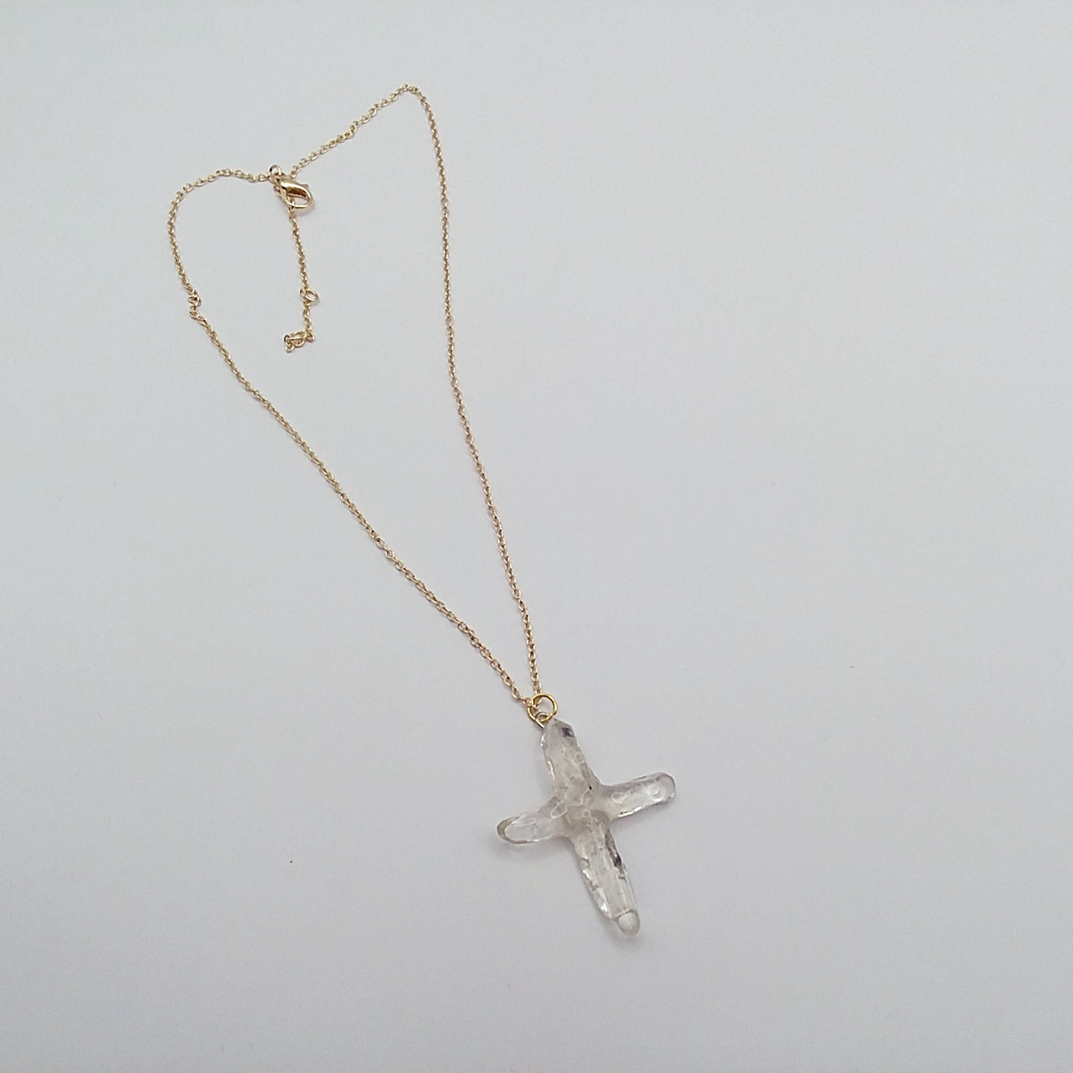 All natural Quartz points hand crafted into a Cross. The cross is one of a kind since no 2 quartz crystals are the same. The points are matched as close as possible by the artist to create a unique work of art. This one is approximately 1 1/2" tall and 1 1/4" wide.  It has a goldtone loop and comes with a 16" chain necklace that extends to approximately 18".  The photos are of the actual necklace for sale.
