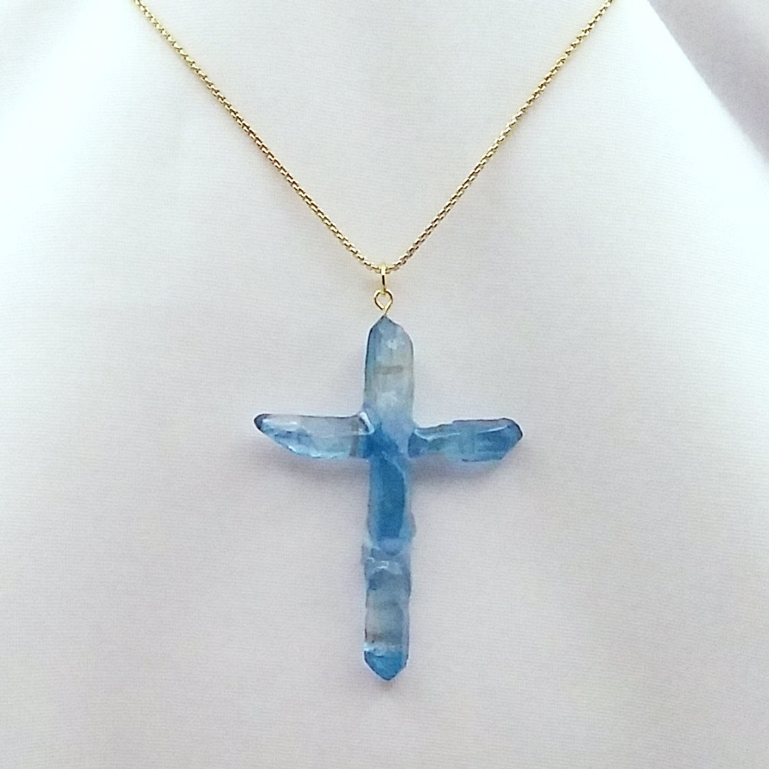 Natural quartz points treated with special metals at high temperature to create the beautiful Blue color.  The cross is one of a kind since no 2 quartz crystals are the same. The points are matched as close as possible by the artist to create a unique work of art. This one is approximately 2 1/2" tall and 1 3/4" wide. It has a gold tone loop and comes with a 22" gold tone adjustable necklace.  The photos are of the actual necklace for sale.