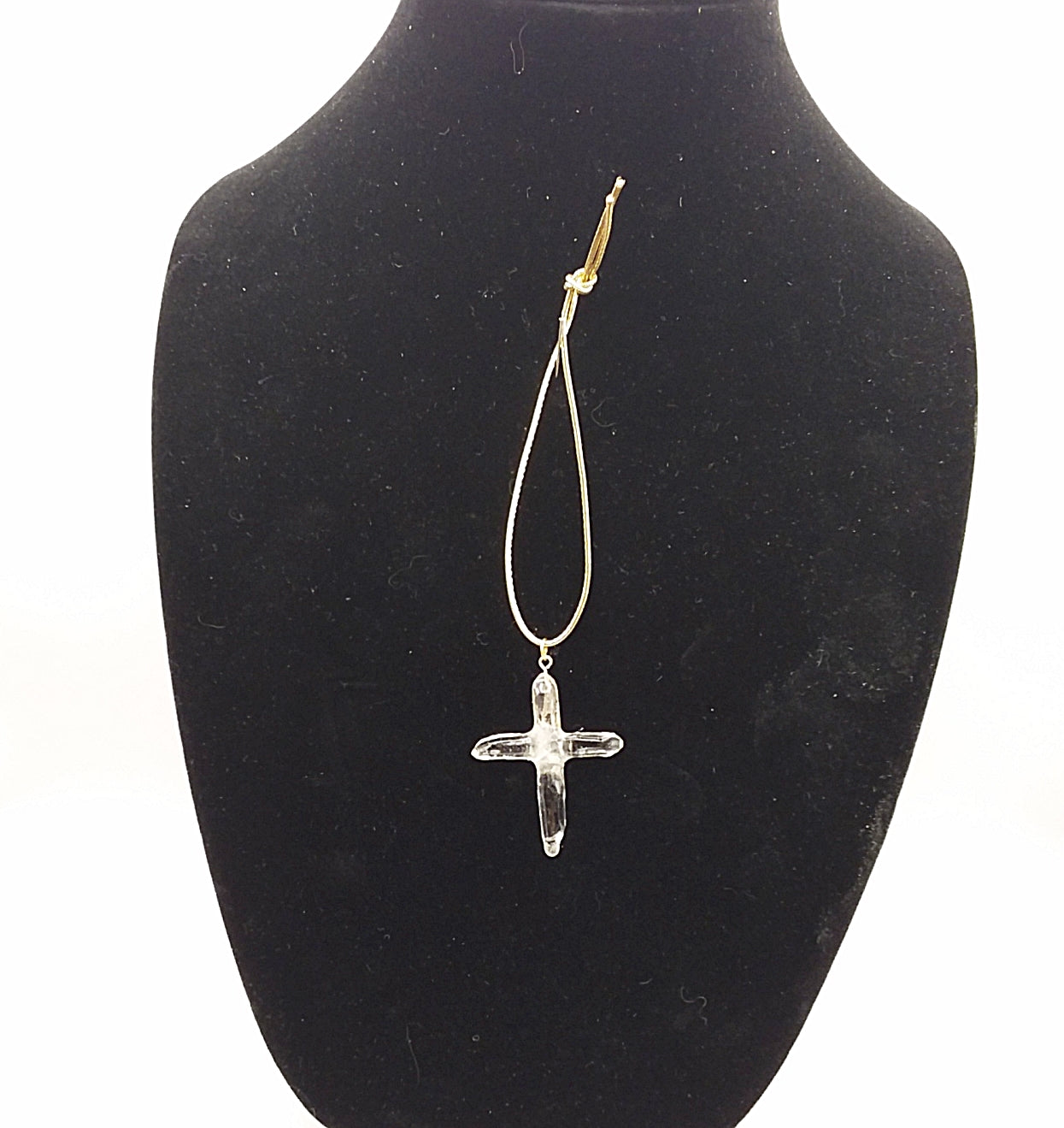 The Christmas Ornament is created from 4 natural quartz points hand crafted into a cross. The ornament is one of a kind since no 2 quartz crystals are the same. The points are matched as close as possible by the artist to create a unique work of art. This one is approximately 1 5/8" tall and 1 1/4" wide.  It has a goldtone loop and a gold cord for hanging on the tree.    The photo is of the actual ornament for sale.