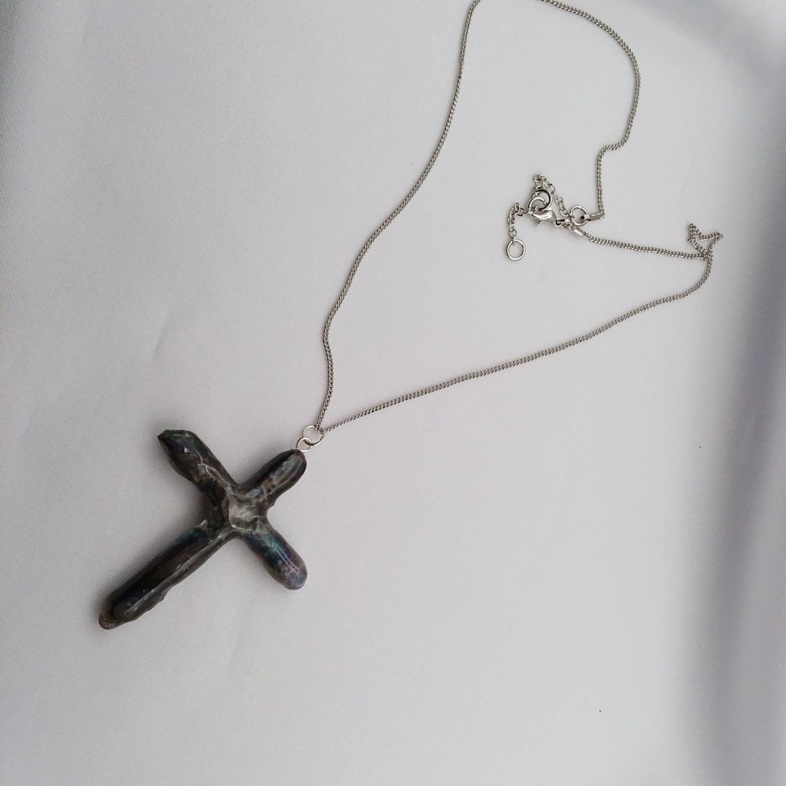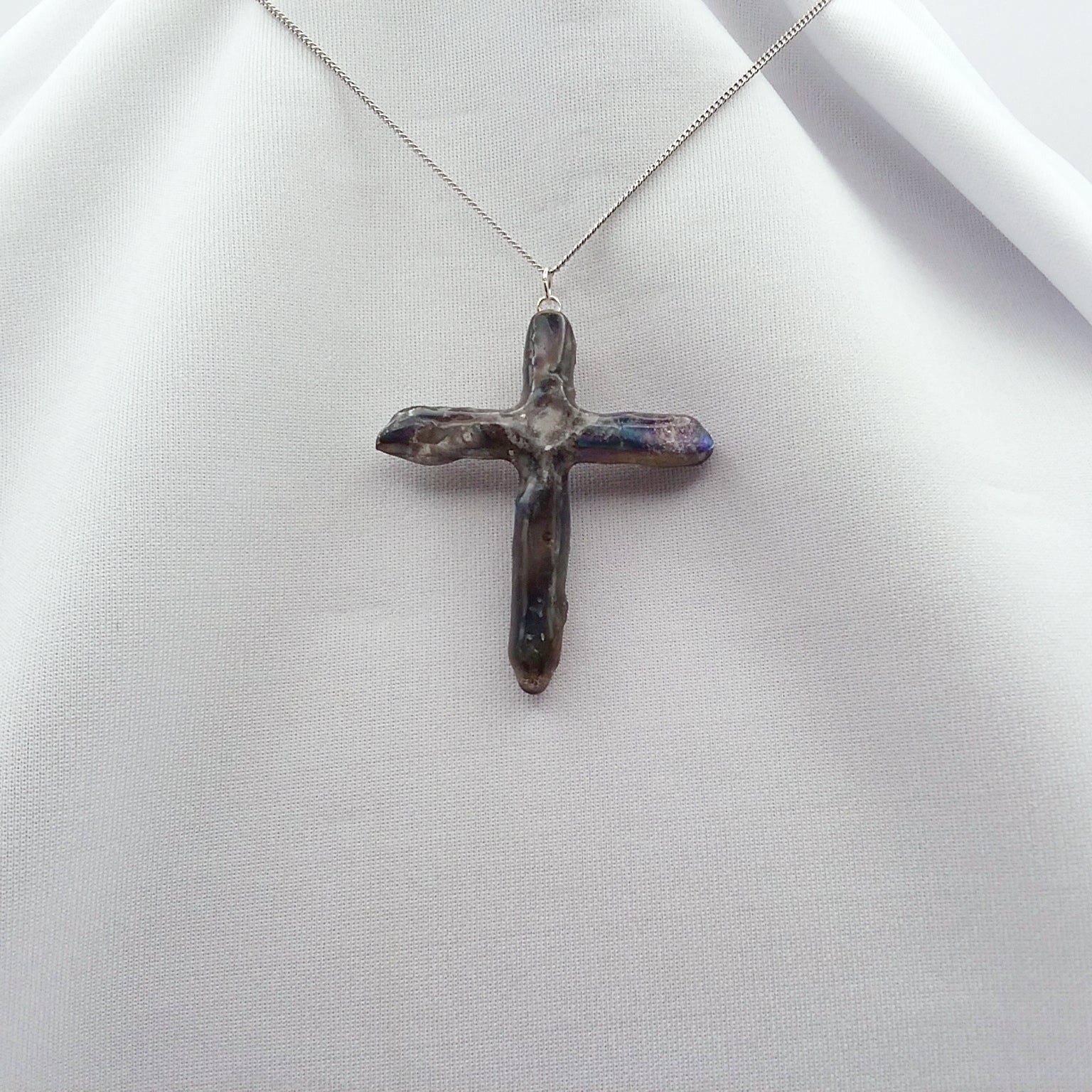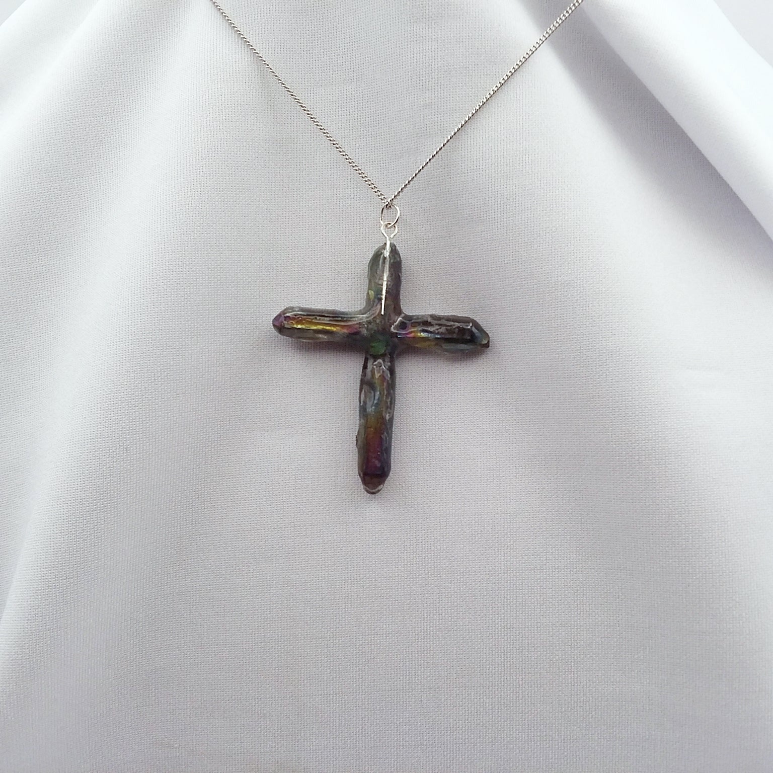 Natural quartz points treated with special metals at high temperature to create the beautiful Rainbow colors.  The cross is one of a kind since no 2 quartz crystals are the same. The points are matched as close as possible by the artist to create a unique work of art. This one is approximately 2" tall and 1 3/4" wide.  It has a silvertone loop and comes with a 16" silvertone necklace that can extend to 18 1/4".   The necklace is made of fine curb links connected tightly, and it has a lobster clasp. The photos are of the actual necklace for sale.