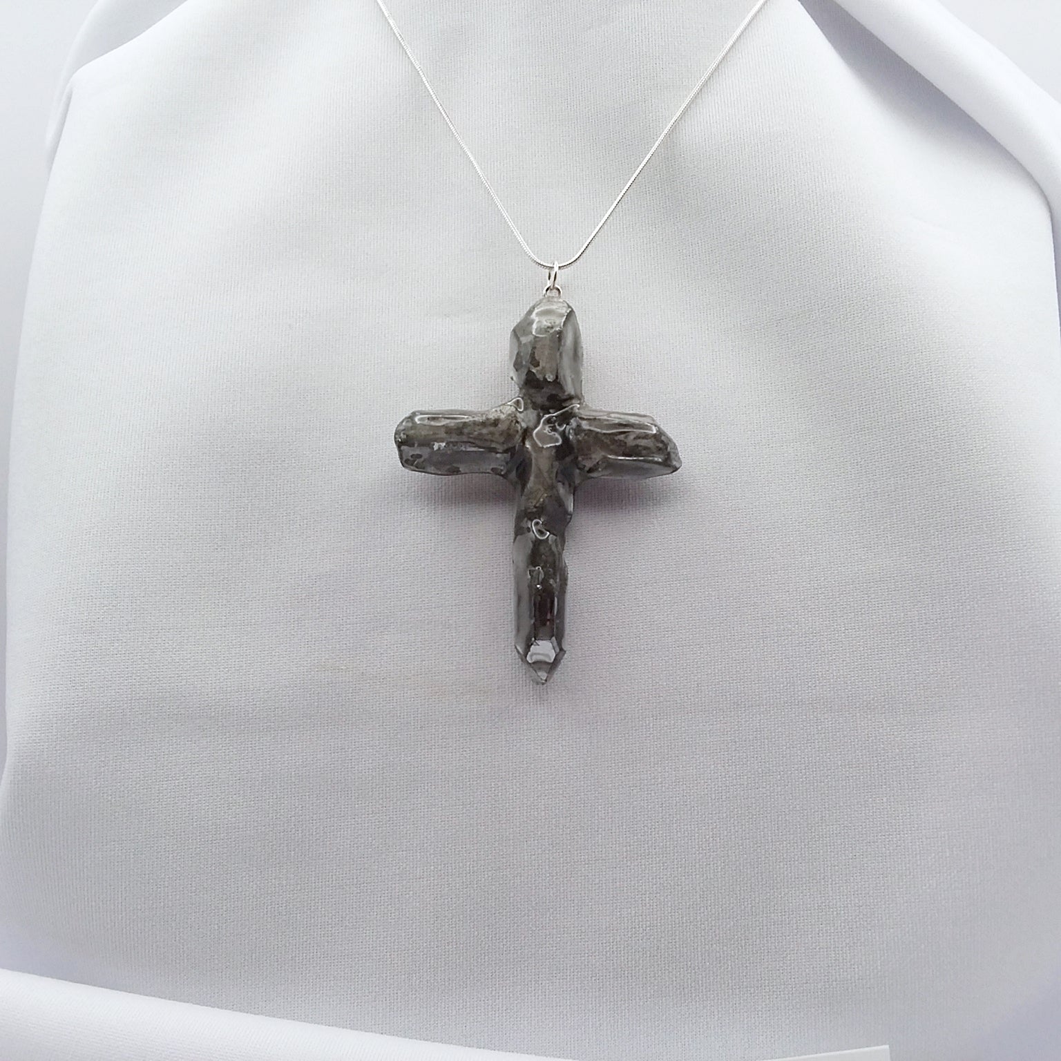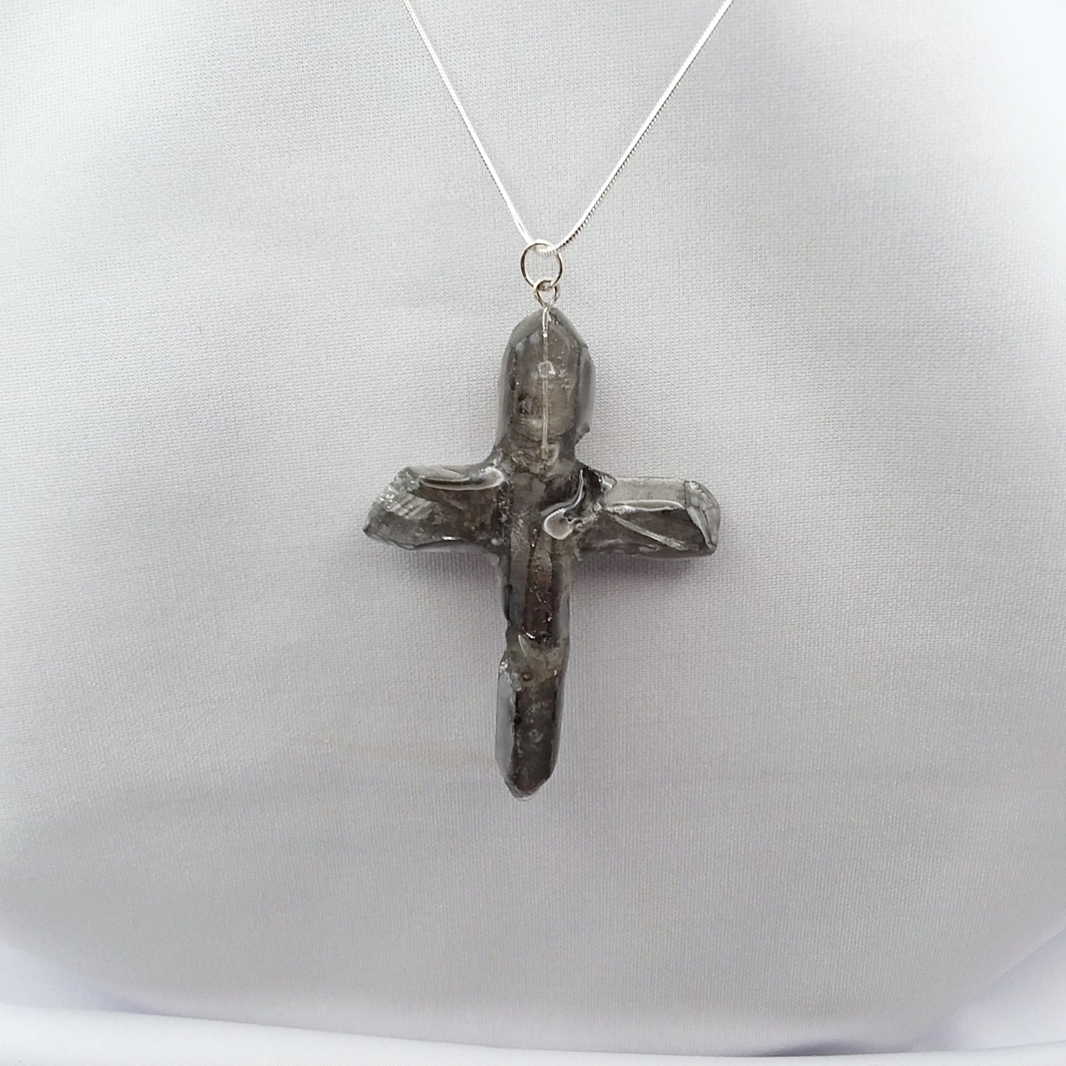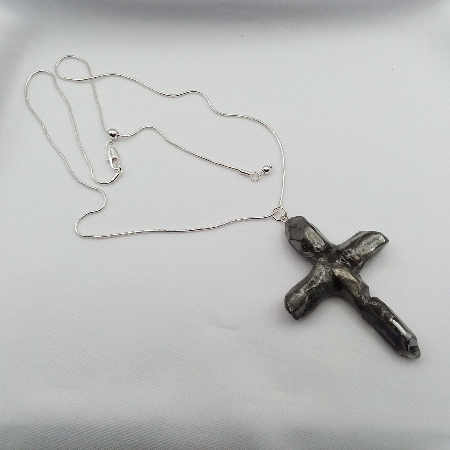 Natural quartz points treated with special metals at high temperature to create the beautiful Silver color.  The cross is one of a kind since no 2 quartz crystals are the same. The points are matched as close as possible by the artist to create a unique work of art. This one is approximately 2 3/4" tall and 2" wide.  It has a silvertone loop and comes with a silvertone snake chain slider necklace that is adjustable by moving the slider bead to the length of your choice up to 22".  The photos are of the actual necklace for sale.